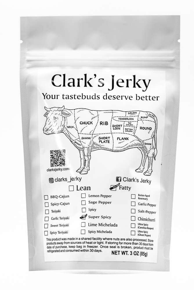 Clark’s dream to make the best beef jerky in Texas was born when he was 12 years old. Looking to save money on snacks for camping trips, his father bought him his first donut style Westinghouse dehydrator. And also taught him the different cuts of beef, their uses, and the best ways of making jerky from those cuts. After purchasing a pack of inside skirt steak from the local grocery store, mixing up some sauces and seasonings that were in the pantry, Clark made his first batch of BBQ-Cajun jerky. With time and practice in the years following, he has mastered the art of making the tastiest, homemade-style beef jerky Texas has to offer.